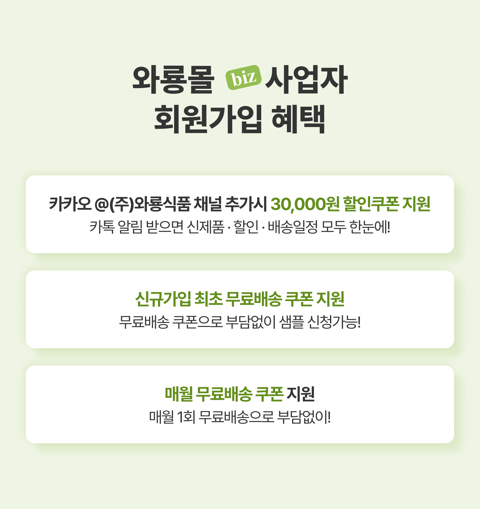 주식회사 와룡식품 사이트의 상품/판매자/쇼핑정보, 컨텐츠, UI 등에 대한 무단 복제, 전송, 배포, 스크래핑 등의 행위는 저작권법, 콘텐츠사업 진흥법 등에 의하여 엄격히 금지됩니다.